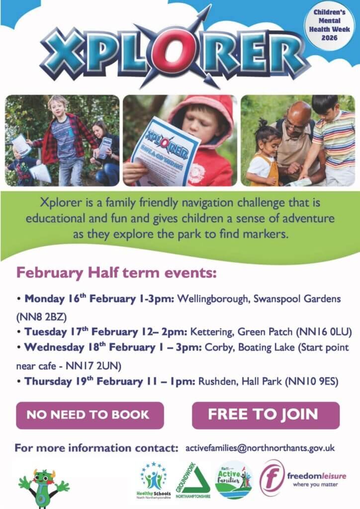 There are 4 Family Xplorer events taking place across North Northants during half term. These free navigation challenges are fun for the whole family. Events are happening in Swanspool Gardens Monday 16th 1-3pm, Green Patch, Kettering Tues 17th 12-2pm, Corby Boating Lake Weds 18th 1-3pm and Rushden Hall Park on Thurs 19th 11am-1pm