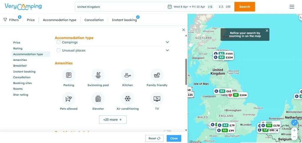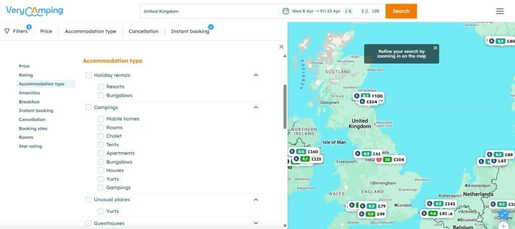 As mentioned, this platform is built specifically for established, bookable sites. Meaning if your heart is set on “wild camping” (pitching up in the middle of nowhere without facilities), you won’t find those locations with verycamping.